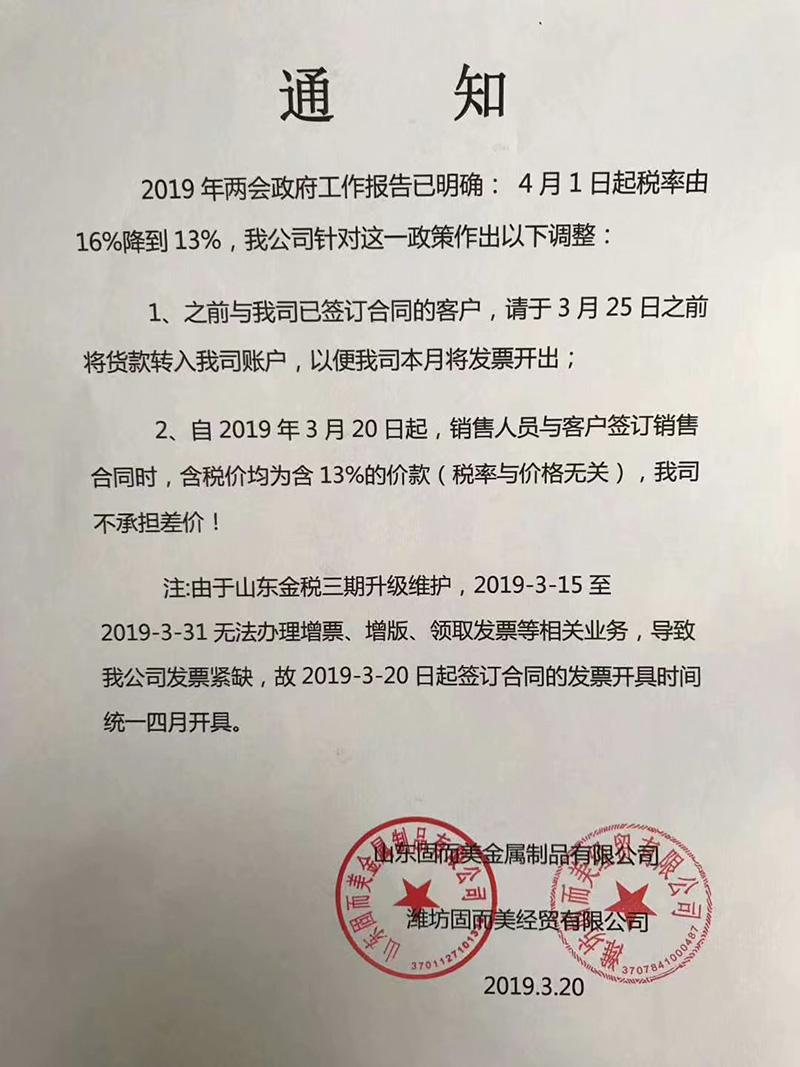 關於19年兩會提出的稅率調整情(qíng)況,我司調整如下: